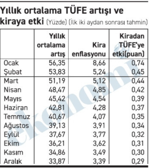 Kira artışını daha aşağı çekmek hiç mümkün görünmüyor. Hatta tam tersine aylık artışların 2 puanı aşması ve buna bağlı olarak kira tavanına ilişkin oranı belirleyen yıllık ortalama artışın daha yukarıda oluşması olasılığı da var. Bu durumda kiranın etkisi daha da belirgin bir hal alabilir ve daha şimdiden yüzde 24’lük öngörüye göre 19 puana, yüzde 30’luk öngörüye göre 25 puana inmiş olan hareket alanı daha da daralır.