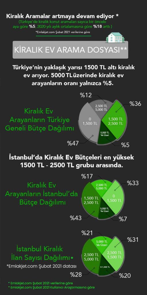 Şubat ayı verilerini değerlendiren Emlakjet CEO’su Tolga İdikat, son dönemlerde üye ofislerinden kiralık arzının düşük olduğu yönünde geri bildirim aldıklarını belirterek “Emlakjet verilerine göre kiralık aramaları bu ay ocak ayına göre yüzde 5, 2020 yılı aylık ortalamasına göre ise yüzde 18 daha fazla gerçekleşti. Talebin artarken arzın kısıtlı olması kiralık piyasasını zorluyor. Bu yüzden Emlakjet’in Şubat 2021 Gayrimenkul Raporu Kiralık Dosyası’na odaklandı. Kullanıcılarımızın katılımıyla gerçekleştirdiğimiz araştırmada Şubat 2021 itibariyle Türkiye genelinde kiralık ev arama bütçesi kullanıcıların yaklaşık yarısında 1.500 TL’nin altında. İstanbul’da ise 1.500 TL ile 2.500 TL arasında kiralık bütçeye sahip olanlar çoğunlukta. Kullanıcıların yüzde 46’sı ise 2 aydan uzun süredir kiralık konut aradığını belirtti. Pandemi sürecinde normal seyre ulaşana kadar kiralık piyasasında arz talep dengesizliğinin devam edeceğini düşünüyoruz.” dedi.