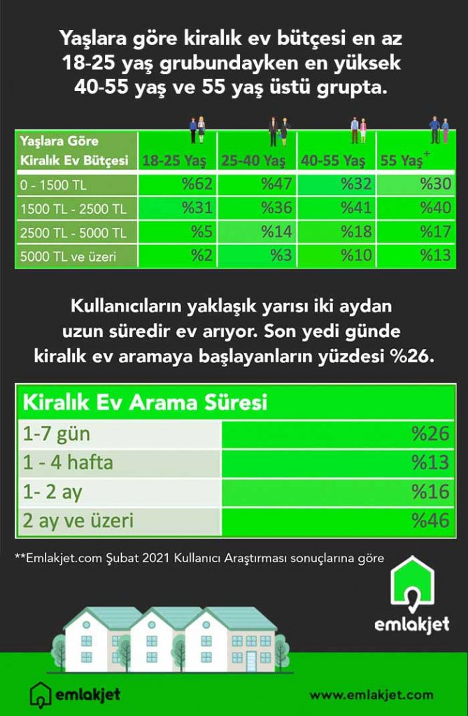 Emlakjet verilerine göre kiralık konut arayanların yüzde 46’sı 2 aydan uzun süredir kiralık ev arıyor. Kiralık konut adedinin az olmasının yanı sıra, bütçelerin de sınırlı olması nedeniyle kullanıcılar uzun süre aramak zorunda kalıyor.