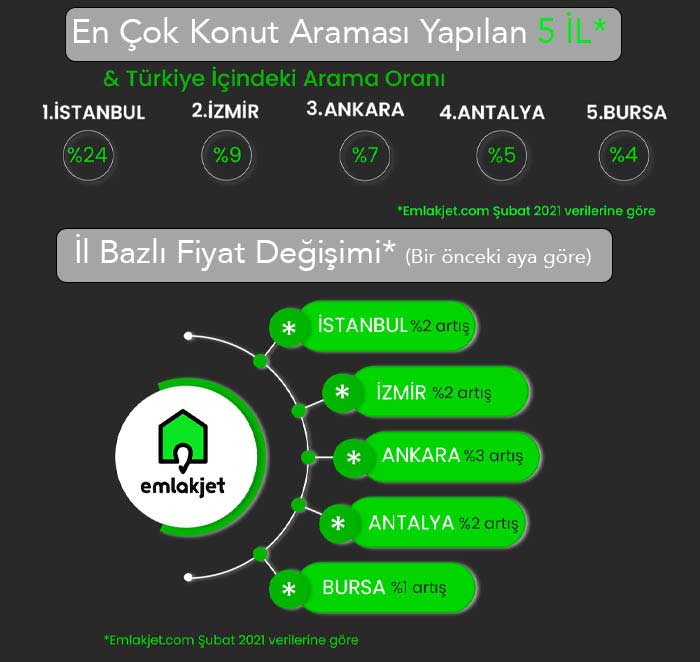 Şubat ayında Türkiye’de en çok konut araması yapılan 5 il sırasıyla İstanbul (yüzde 24), İzmir (yüzde 9), Ankara (yüzde 7), Antalya (yüzde 5) ve Bursa (yüzde 4) olurken, satılık konutlarda fiyat artışında liderliği ocak ayına göre yüzde 3 yükselişle Ankara elde etti. İstanbul, İzmir ve Antalya’da satılık konut fiyatlarında ocak ayına göre yüzde 2 artış gözlemlenirken, ilk 5 şehir arasında Bursa ocak ayına göre yüzde 1 ile en az fiyat artışı görülen il oldu.