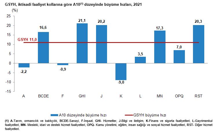 GSYH’yi oluşturan faaliyetler incelendiğinde; 2021 yılında bir önceki yıla göre zincirlenmiş hacim endeksi olarak; hizmet faaliyetleri toplam katma değeri %21,1, diğer hizmetler %20,3, bilgi ve iletişim faaliyetleri %20,2, mesleki, idari ve destek hizmet faaliyetleri %17,3, sanayi %16,6, kamu yönetimi, eğitim, insan sağlığı ve sosyal hizmet faaliyetleri %7,0 ve gayrimenkul faaliyetleri %3,5 arttı. Finans ve sigorta faaliyetleri %9,0, tarım sektörü %2,2 ve inşaat sektörü ise %0,9 azaldı.