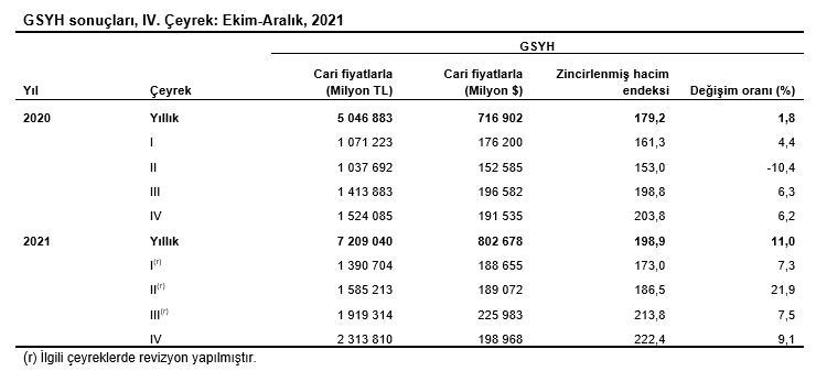 Üretim yöntemiyle Gayrisafi Yurt İçi Hasıla tahmini, 2021 yılının dördüncü çeyreğinde cari fiyatlarla bir önceki yılın aynı çeyreğine göre %51,8 artarak 2 trilyon 313 milyar 810 milyon TL oldu. GSYH’nin dördüncü çeyrek değeri cari fiyatlarla ABD doları bazında 198 milyar 968 milyon olarak gerçekleşti.