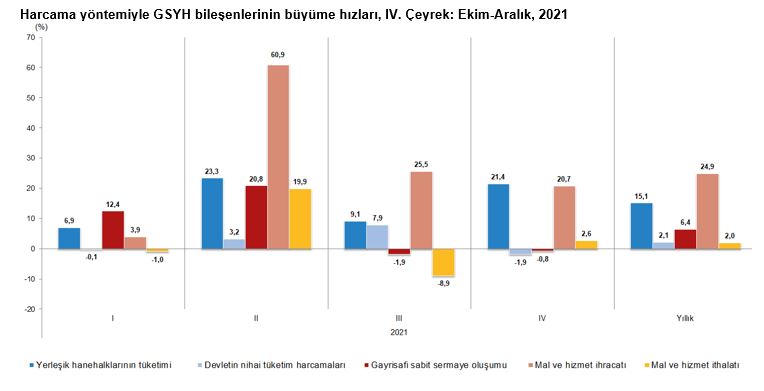 Yerleşik hanehalklarının nihai tüketim harcamaları 2021 yılının dördüncü çeyreğinde bir önceki yılın aynı çeyreğine göre zincirlenmiş hacim endeksi olarak %21,4 arttı. Devletin nihai tüketim harcamaları %1,9, gayrisafi sabit sermaye oluşumu ise %0,8 azaldı.