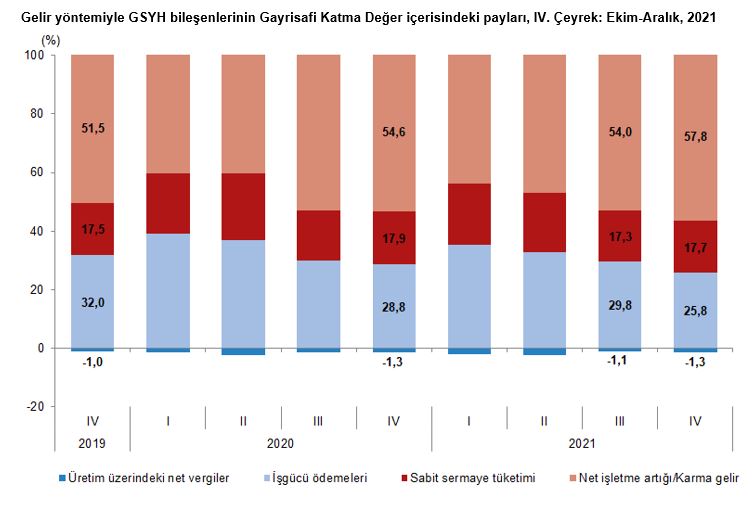 İşgücü ödemeleri 2021 yılında bir önceki yıla göre %31,4 artarken, net işletme artığı/karma gelir %53,2 arttı. 2021 yılının dördüncü çeyreğinde ise işgücü ödemeleri bir önceki yılın aynı çeyreğine göre %37,7 artarken, net işletme artığı/karma gelir %62,9 arttı.