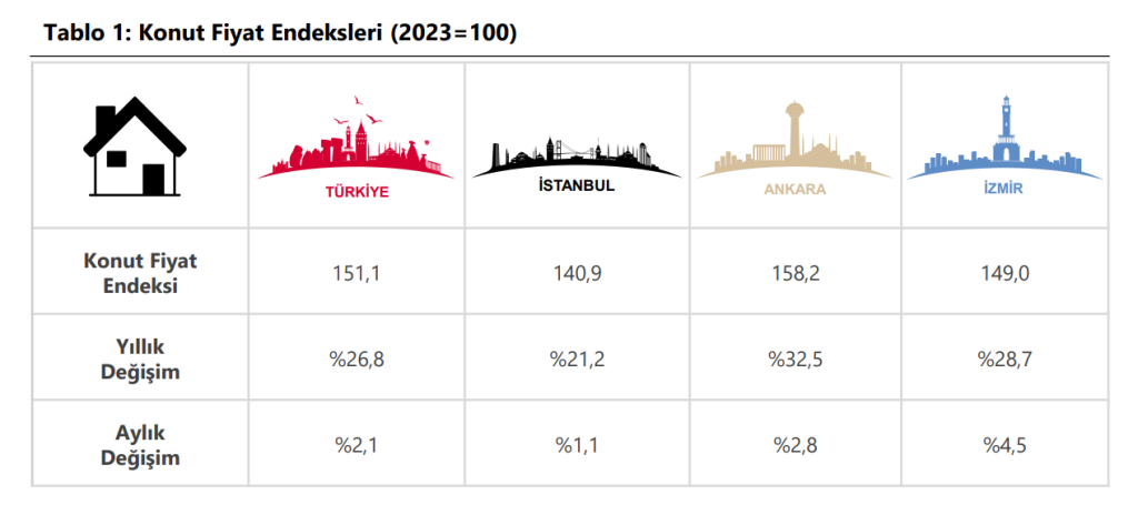 İstanbul, Ankara ve İzmir’in konut fiyat endekslerindeki gelişmeler değerlendirildiğinde, 2024 yılı Ekim ayında bir önceki aya göre, sırasıyla yüzde 1.1, 2.8 ve 4.5 oranlarında artış gözlenmiştir. Endeks değerleri bir önceki yılın aynı ayına göre, İstanbul, Ankara ve İzmir’de sırasıyla yüzde 21.2, 32.5 ve 28.7 oranlarında artış göstermiştir.”