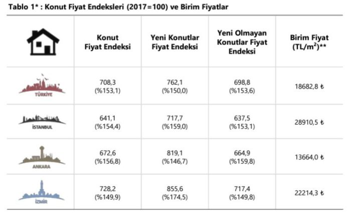 Ocak ayı itibarıyla konut fiyatları İstanbul’da yüzde 154.4, Ankara’da yüzde 156.8, İzmir’de yüzde 149.9 olarak gerçekleşti.