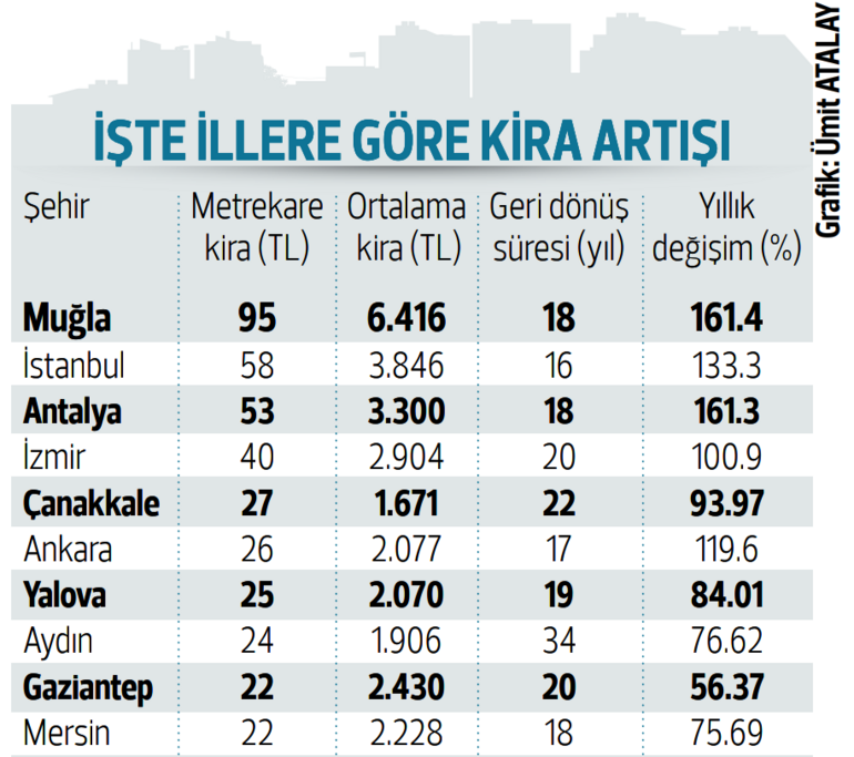 Ülke genelinde, yıllık kira artışında yüzde 161.4 ile Muğla ilk sırada yer alırken yüzde 161.3’lük artış oranıyla Antalya ikinci sırada bulunuyor. Muğla’da ortalama konut kiraları aylık 6.416 TL, Antalya’da ise 3.300 TL olarak hesaplandı.