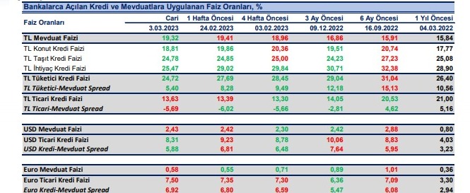 Bankaların TL mevduat için uyguladıkları faiz oranı 03 Mart haftasında bir önceki haftaya göre 9 baz puan azalışla %19.32 olurken, dolar mevduat faizi 1 baz puan artışla %2.43 ve Euro mevduat faizi 3 baz puan artışla %0.58 oldu.