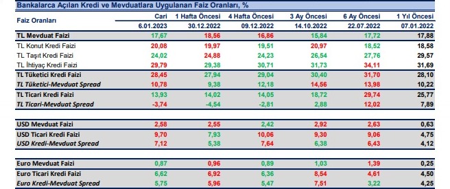 TL bazlı ticari kredilerin faiz oranı ise aynı haftada bir önceki haftaya göre 9 baz puan azalışla %13.93 oldu. TL bazlı konut kredi faizleri 11 baz puan artışla %20.08; taşıt kredi faizleri 86 baz puan azalışla %24.02 ve ihtiyaç kredi faizleri 41 baz puan artışla %29.79 olarak gerçekleşti.
