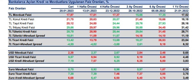 Bankaların TL mevduat için uyguladıkları faiz oranı 20 Ocak haftasında bir önceki haftaya göre 16 baz puan artışla %17.97 olurken, dolar mevduat faizi 1 baz puan artışla %2.38 ve Euro mevduat faizi 22 baz puan azalışla %0.70 oldu.