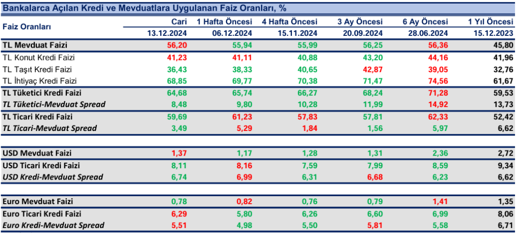 Bankaların TL mevduat için uyguladıkları faiz oranı 13 Aralık haftasında bir önceki haftaya göre 26 baz puan artışla %56.20 olurken, dolar mevduat faizi 20 baz puan artışla %1.37 ve Euro mevduat faizi 4 baz puan azalışla %0.78 oldu.