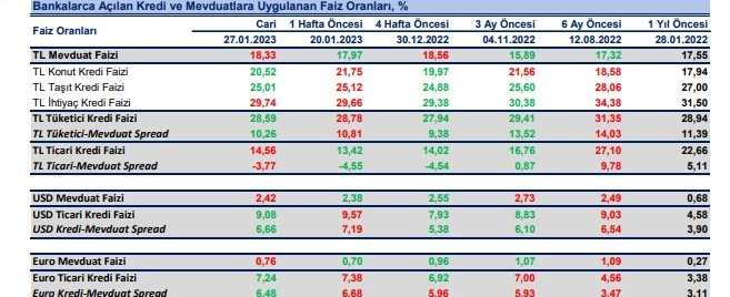 Bankaların TL mevduat için uyguladıkları faiz oranı 27 Ocak haftasında bir önceki haftaya göre 36 baz puan artışla %18.33 olurken, dolar mevduat faizi 4 baz puan artışla %2.42 ve Euro mevduat faizi 6 baz puan artışla %0.76 oldu.