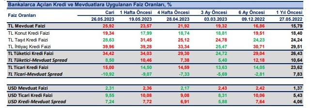 Bankaların TL mevduat için uyguladıkları faiz oranı 26 Mayıs haftasında bir önceki haftaya göre 235 baz puan artışla %25.92 olurken, dolar mevduat faizi 5 baz puan azalışla %2.31 ve Euro mevduat faizi 24 baz puan artışla %0.90 oldu.