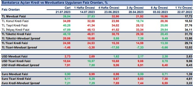 Bankaların TL mevduat için uyguladıkları faiz oranı 21 Temmuz haftasında bir önceki haftaya göre 179 baz puan azalışla %26.04 olurken, dolar mevduat faizi 4 baz puan artışla %2.73 ve Euro mevduat faizi 9 baz puan azalışla %0.90 oldu.