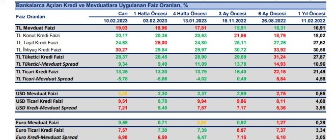 Bankaların TL mevduat için uyguladıkları faiz oranı 10 Şubat haftasında bir önceki haftaya göre 7 baz puan artışla %19.03 olurken, dolar mevduat faizi 0 baz puan azalışla %2.30 ve Euro mevduat faizi 12 baz puan azalışla %0.59 oldu.