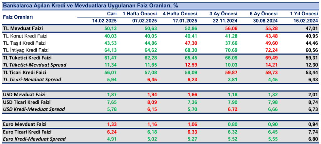 Bankaların TL mevduat için uyguladıkları faiz oranı 14 Şubat haftasında bir önceki haftaya göre 50 baz puan azalışla %50.13 olurken, dolar mevduat faizi 7 baz puan azalışla %1.87 Euro mevduat faizi 17 baz puan artışla %1.33 oldu.