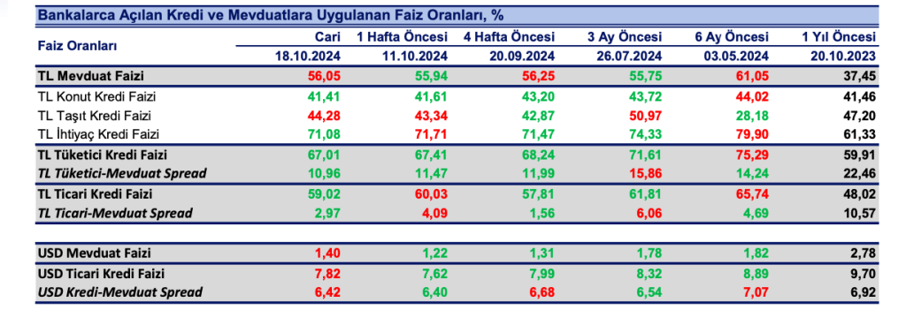 Bankaların TL mevduat için uyguladıkları faiz oranı 18 Ekim haftasında bir önceki haftaya göre 11 baz puan artışla %56.05 olurken, dolar mevduat faizi 18 baz puan artışla %1.40 ve Euro mevduat faizi 12 baz puan artışla %0.87 oldu.