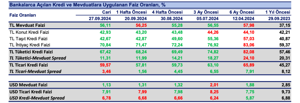 Bankaların TL mevduat için uyguladıkları faiz oranı 27 Eylül haftasında bir önceki haftaya göre 14 baz puan azalışla %56.11 olurken, dolar mevduat faizi 18 baz puan azalışla %1.13 ve Euro mevduat faizi 2 baz puan azalışla %0.77 oldu.
