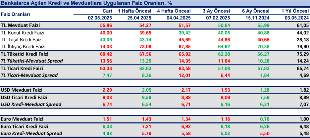 Bankaların TL mevduat için uyguladıkları faiz oranı 02 Mayıs haftasında bir önceki haftaya göre 159 baz puan artışla %55.86 olurken, dolar mevduat faizi 24 baz puan artışla %2.29 ve Euro mevduat faizi 8 baz puan artışla%1.51 oldu.