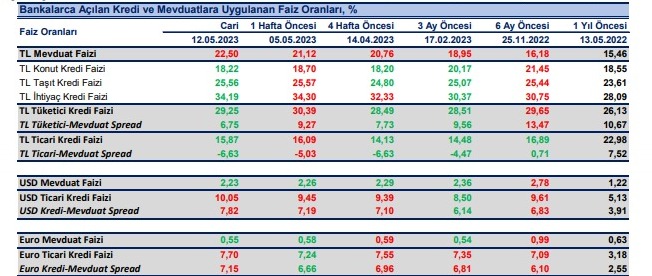 Bankaların TL mevduat için uyguladıkları faiz oranı 12 Mayıs haftasında bir önceki haftaya göre 138 baz puan artışla %22.50 olurken, dolar mevduat faizi 3 baz puan azalışla %2.23 ve Euro mevduat faizi 3 baz puan azalışla %0.55 oldu.