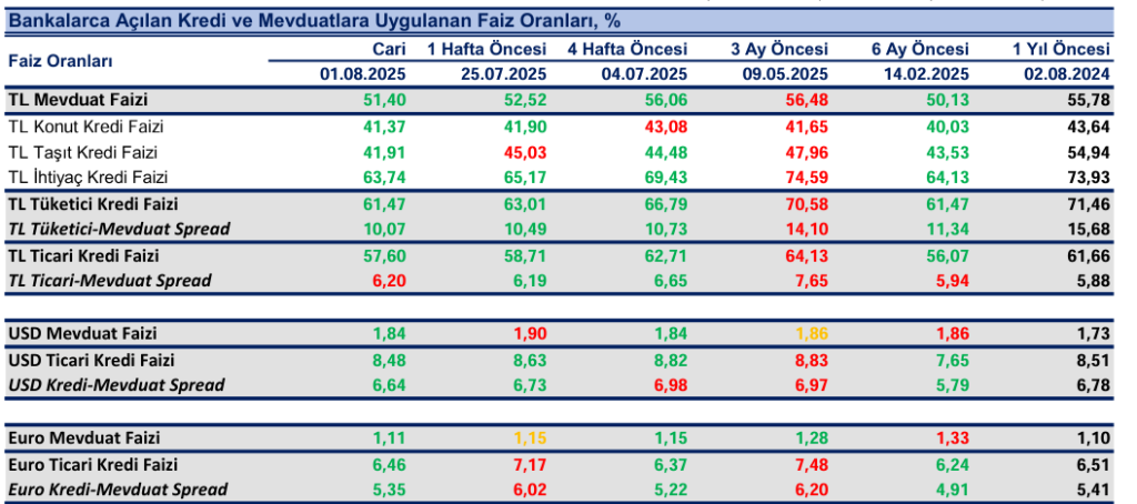 Bankaların TL mevduat için uyguladıkları faiz oranı 1 Ağustos haftasında bir önceki haftaya göre 112 baz puan azalışla %51.40 olurken, dolar mevduat faizi 6 baz puan azalışla %1.84 ve Euro mevduat faizi 4 baz puan azalışla%1.11 oldu.