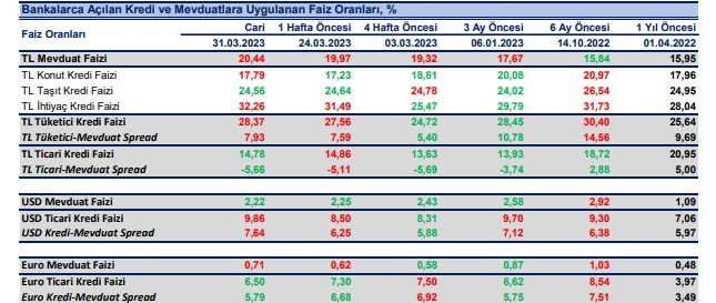 Bankaların TL mevduat için uyguladıkları faiz oranı 31 Mart haftasında bir önceki haftaya göre 47 baz puan artışla %20.44 olurken, dolar mevduat faizi 3 baz puan azalışla %2.22 ve Euro mevduat faizi 9 baz puan artışla %0.71 oldu.