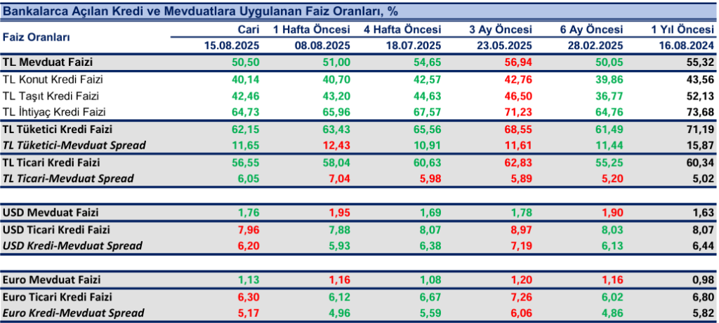 Bankaların TL mevduat için uyguladıkları faiz oranı 15 Ağustos haftasında bir önceki haftaya göre 50 baz puan azalışla %50.50 olurken, dolar mevduat faizi 19 baz puan azalışla %1.76 ve Euro mevduat faizi 3 baz puan azalışla%1.13 oldu.