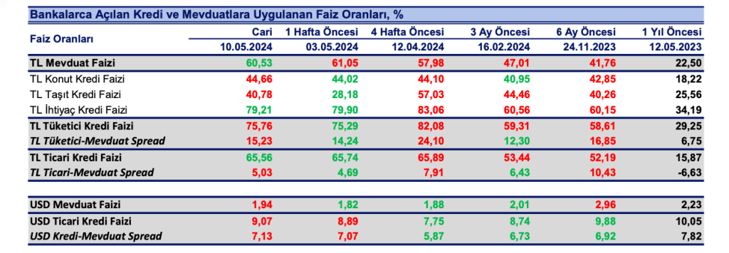 Bankaların TL mevduat için uyguladıkları faiz oranı 10 Mayıs haftasında bir önceki haftaya göre 52 baz puan azalışla %60.53 olurken, dolar mevduat faizi 12 baz puan artışla %1.94 ve Euro mevduat faizi de 12 baz puan artışla %1.12 oldu.