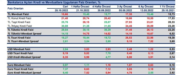 Bankaların TL mevduat için uyguladıkları faiz oranı 28 Ekim haftasında bir önceki haftaya göre 26 baz puan artışla %15.66 olurken, dolar mevduat faizi 19 baz puan azalışla %2.84 ve Euro mevduat faizi 14 baz puan azalışla %0.97 oldu.
