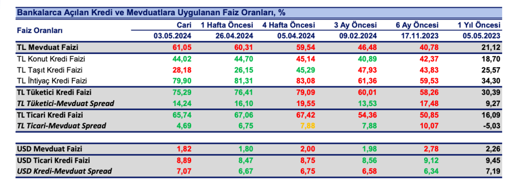 TL bazlı ticari kredilerin faiz oranı ise aynı haftada bir önceki haftaya göre 132 baz puan azalışla %65.74 oldu. TL bazlı konut kredi faizleri 68 baz puan azalışla %44.02; taşıt kredi faizleri 203 baz puan artışla %28.18 ve ihtiyaç kredi faizleri 141 baz puan azalışla %79.90 olarak gerçekleşti.