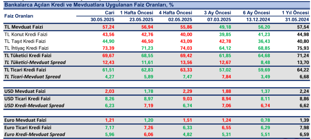 Bankaların TL mevduat için uyguladıkları faiz oranı 30 Mayıs haftasında bir önceki haftaya göre 30 baz puan artışla %57.24 olurken, dolar mevduat faizi 25 baz puan artışla %2.03 ve Euro mevduat faizi 1 baz puan artışla%1.21 oldu.