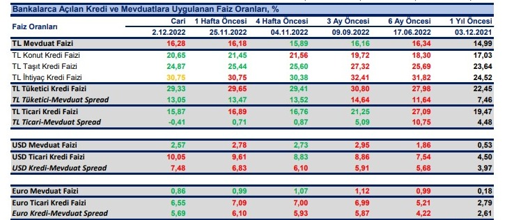 TL bazlı ticari kredilerin faiz oranı ise aynı haftada bir önceki haftaya göre 102 baz puan azalışla %15.87 oldu. TL bazlı konut kredi faizleri 80 baz puan azalışla %20.65; taşıt kredi faizleri 57 baz puan azalışla %24.87 ve ihtiyaç kredi faizleri 0 baz puan azalışla %30.75 olarak gerçekleşti.