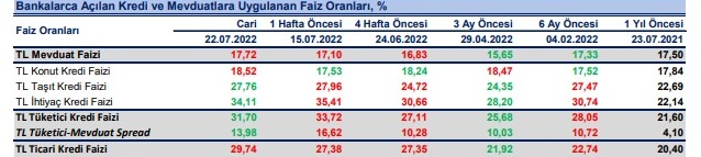 Bankaların TL mevduat için uyguladıkları faiz oranı 22 Temmuz haftasında bir önceki haftaya göre 62 baz puan artışla %17.72 olurken, dolar mevduat faizi 52 baz puan artışla %2.63 ve Euro mevduat faizi 43 baz puan artışla %1.39 oldu.