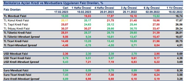 Bankaların TL mevduat için uyguladıkları faiz oranı 17 Şubat haftasında bir önceki haftaya göre 8 baz puan azalışla %18.95 olurken, dolar mevduat faizi 6 baz puan artışla %2.36 ve Euro mevduat faizi 5 baz puan azalışla %0.54 oldu.