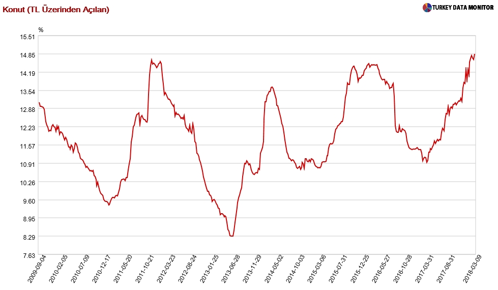 Merkez Bankası’nın verilerine göre konut kredisi faizleri 9 Mart haftası itibariyle yıllık ortalama olarak yüzde 14,85 seviyesine kadar çıktı. Böylelikle konut kredisinde faizler 2009 Ağustos ayından bu yana en yüksek seviyelere ulaşmış oldu.