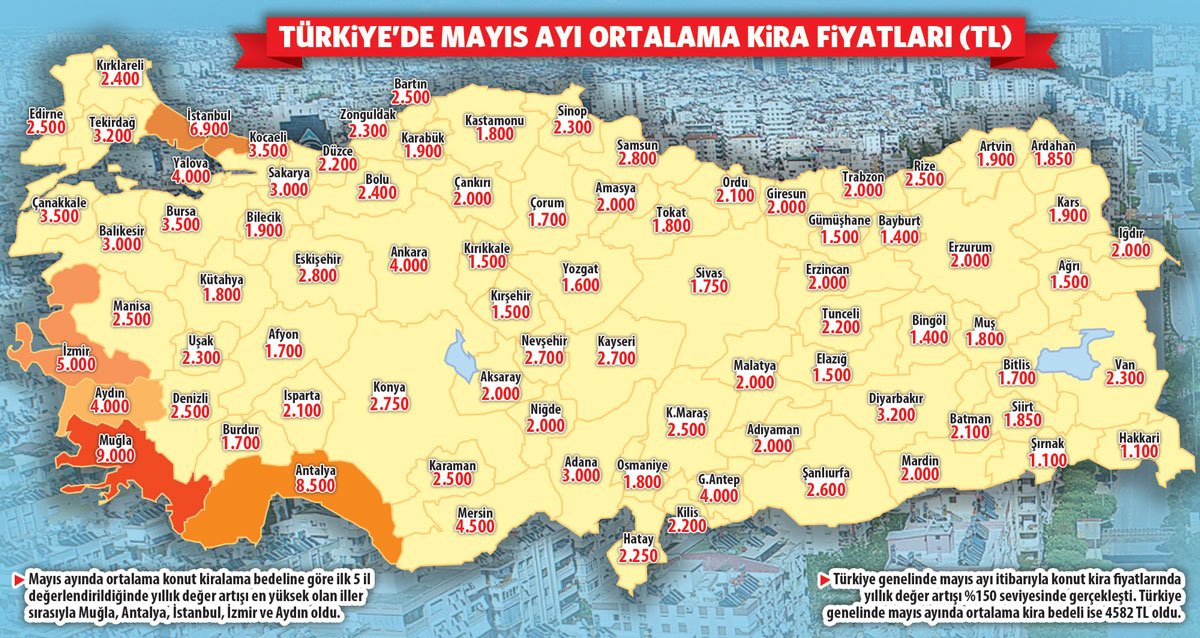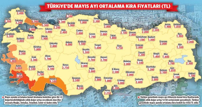 Araştırmaya göre mayıs ayında Türkiye genelinde yeni kiraya verilmiş konutlarda kira fiyatları bir önceki yıla göre yüzde 150 oranında artarken, konut kiralarında en çok artışın yaşandığı iller Muğla, Antalya, İstanbul, İzmir ve Aydın oldu.