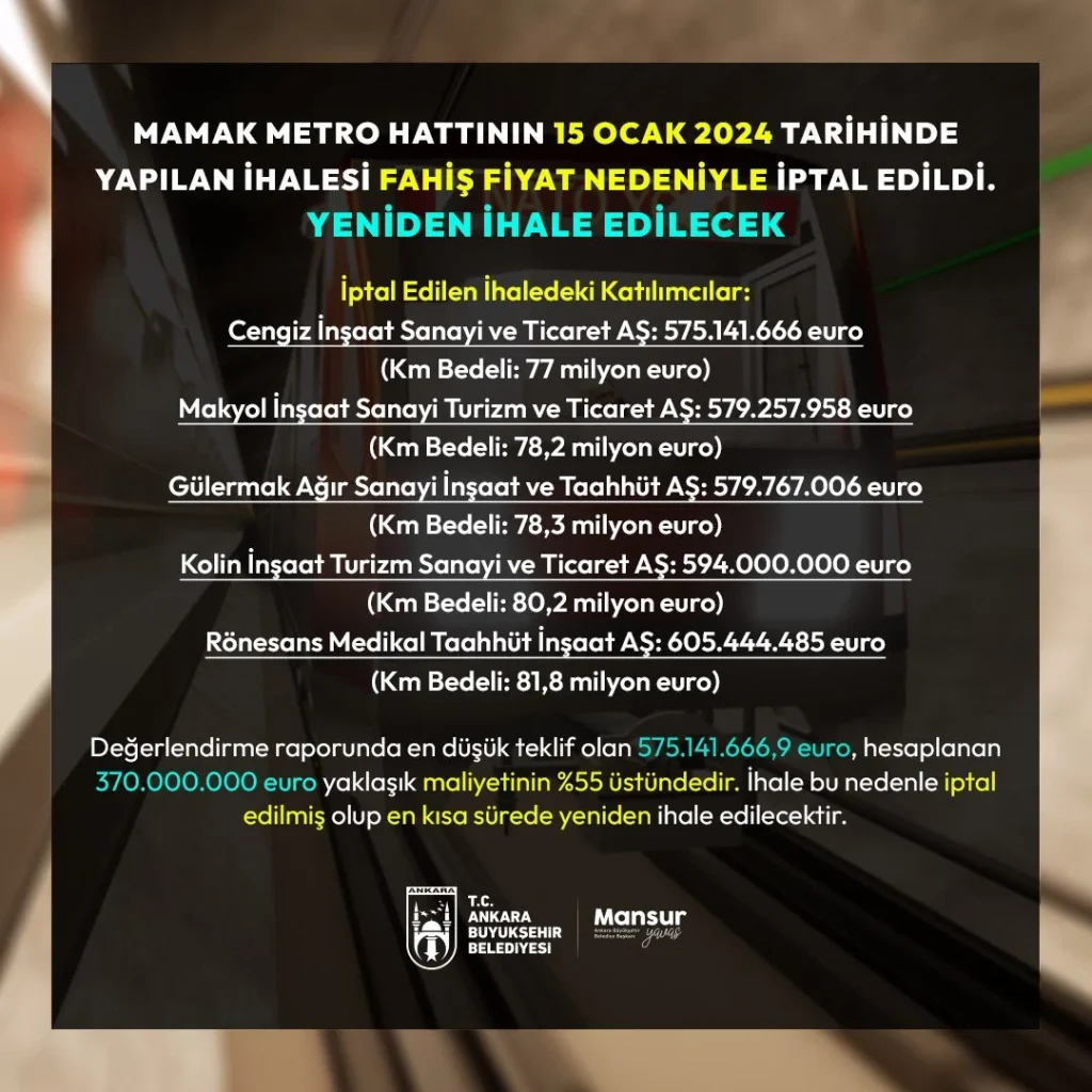 Ankara Büyükşehir Belediyesi’nden yapılan açıklamada “Mamak metro hattının daha önce yapılan ihalesi fahiş fiyat nedeniyle iptal edildi, yeniden yapılacaktır” ifadeleri kullanıldı.