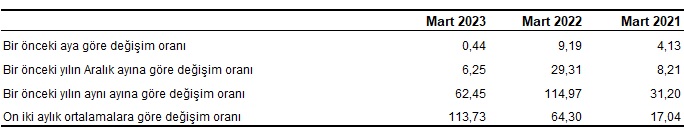 Mart ayında Tüketici Fiyat Endeksi (TÜFE) aylık yüzde 2.29, yıllık yüzde 50.51 arttı. Yurt İçi Üretici Fiyat Endeksi ise aylık yüzde 0.44, yıllık yüzde 62.45 yükseldi. 12 aylık ortalamalara göre TÜFE yüzde 70.20, Yİ-ÜFE yüzde 113.73 oldu.