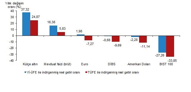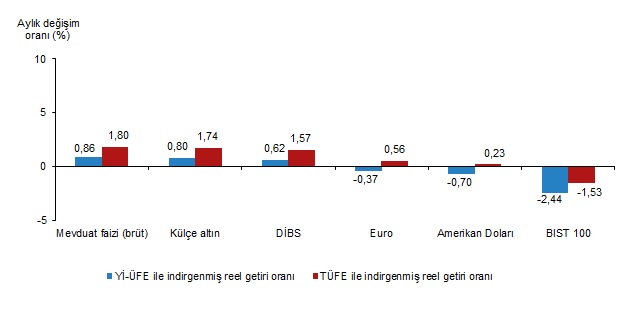Yİ-ÜFE ile indirgendiğinde; yatırım araçlarından külçe altın %0,80 ve Devlet İç Borçlanma Senetleri (DİBS) %0,62 oranlarında yatırımcısına reel getiri sağlarken; Euro %0,37, Amerikan Doları %0,70 ve BIST 100 endeksi %2,44 oranlarında yatırımcısına kaybettirdi. TÜFE ile indirgendiğinde ise; külçe altın %1,74, DİBS %1,57, Euro %0,56 ve Amerikan Doları %0,23 oranlarında yatırımcısına reel getiri sağlarken; BIST 100 endeksi %1,53 oranında yatırımcısına kaybettirdi.