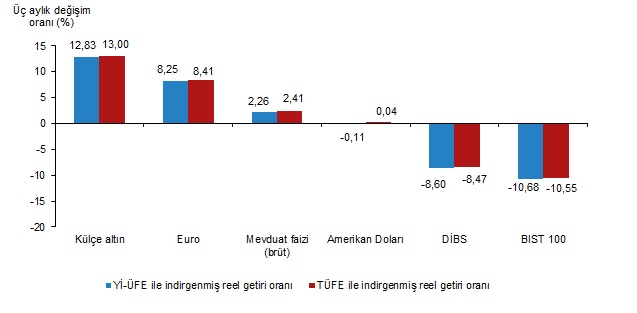 Külçe altın, üç aylık değerlendirmede; Yİ-ÜFE ile indirgendiğinde %12,83, TÜFE ile indirgendiğinde ise %13,00 oranlarında yatırımcısına en yüksek reel getiri sağlayan yatırım aracı oldu. Aynı dönemde BIST 100 endeksi, Yİ-ÜFE ile indirgendiğinde %10,68, TÜFE ile indirgendiğinde ise %10,55 oranlarında yatırımcısına en çok kaybettiren yatırım aracı oldu.