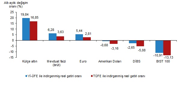 Altı aylık değerlendirmeye göre külçe altın; Yİ-ÜFE ile indirgendiğinde %19,84, TÜFE ile indirgendiğinde ise %16,85 oranlarında yatırımcısına en yüksek reel getiri sağlayan yatırım aracı olurken; aynı dönemde BIST 100 endeksi, Yİ-ÜFE ile indirgendiğinde %10,91, TÜFE ile indirgendiğinde ise %13,13 oranlarında yatırımcısına en çok kaybettiren yatırım aracı oldu.