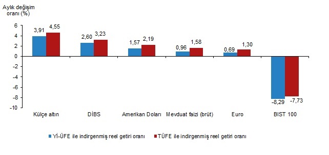 Yİ-ÜFE ile indirgendiğinde; yatırım araçlarından DİBS %2,60, Amerikan Doları %1,57, mevduat faizi (brüt) %0,96, Euro %0,69 oranlarında yatırımcısına reel getiri sağlarken; BIST 100 endeksi %8,29 oranında yatırımcısına kaybettirdi. TÜFE ile indirgendiğinde DİBS %3,23, Amerikan Doları %2,19, mevduat faizi (brüt) %1,58, Euro %1,30 oranlarında yatırımcısına reel getiri sağlarken; BIST 100 endeksi %7,73 oranında yatırımcısına kaybettirdi.