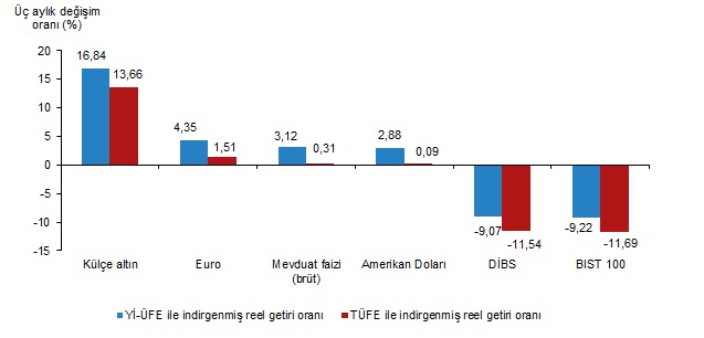 Külçe altın, üç aylık değerlendirmede; Yİ-ÜFE ile indirgendiğinde %16,84, TÜFE ile indirgendiğinde ise %13,66 oranlarında yatırımcısına en yüksek reel getiri sağlayan yatırım aracı olmuştur. Aynı dönemde BIST 100 endeksi, Yİ-ÜFE ile indirgendiğinde %9,22, TÜFE ile indirgendiğinde ise %11,69 oranlarında yatırımcısına en çok kaybettiren yatırım aracı oldu.