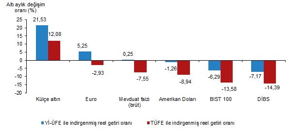 Altı aylık değerlendirmeye göre külçe altın; Yİ-ÜFE ile indirgendiğinde %21,53, TÜFE ile indirgendiğinde ise %12,08 oranlarında yatırımcısına en yüksek reel getiri sağlayan yatırım aracı olurken, aynı dönemde DİBS, Yİ-ÜFE ile indirgendiğinde %7,17, TÜFE ile indirgendiğinde ise %14,39 oranlarında yatırımcısına en çok kaybettiren yatırım aracı oldu.