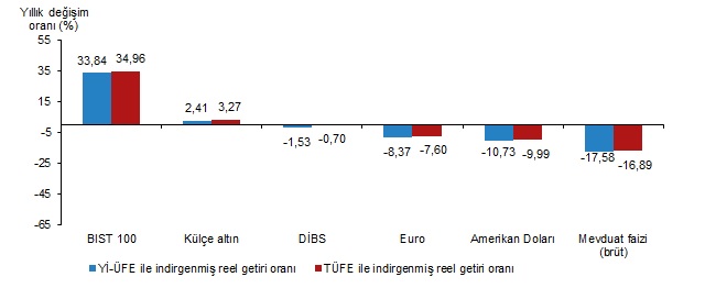 Finansal yatırım araçları yıllık olarak değerlendirildiğinde BIST 100 endeksi; Yİ-ÜFE ile indirgendiğinde %33,84, TÜFE ile indirgendiğinde ise %34,96 oranlarında yatırımcısına en yüksek reel getiri sağlayan yatırım aracı oldu.