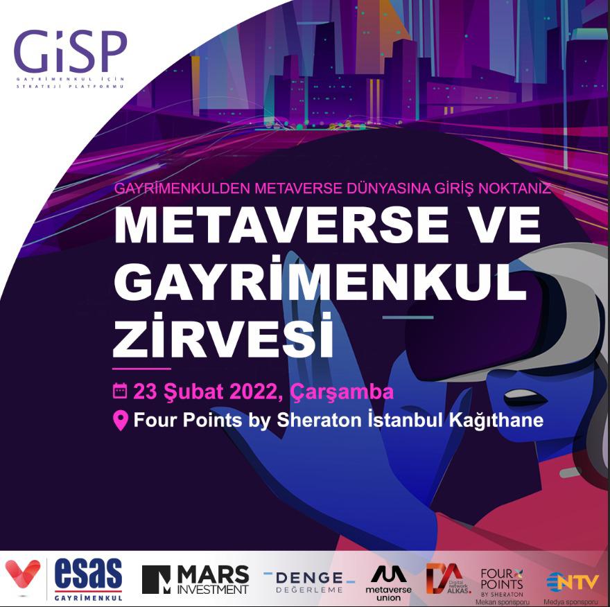 Gayrimenkul için Strateji Platformu (GİSP) tarafından düzenlenen ve Türkiye’nin gayrimenkul alanındaki ilk metaverse konulu zirvesi olan Metaverse ve Gayrimenkul Zirvesi; Esas Gayrimenkul, Mars Investment, Denge Değerleme, Metaverse Union, Digital Network Alkaş ve NTV sponsorluğunda 23 Şubat 2022 çarşamba günü Four Points by Sheraton İstanbul Kağıthane’de gerçekleştirilecek.