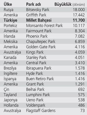Dünyadaki şehir parklarına baktığımız zaman, en çok şehir parkı bulunan Amerika’da dünyanın en büyük şehir parkları arasına giren 5 park bulunuyor. Listede ilk sırada bulunan Bitsevsky Park, Rusya Moskova’da 18 bin dönümlük bir alandan oluşuyor. Park 500’den fazla bitki türüne ev sahipliği yapıyor. 17.4 bin dönüm alana yayılan Griffith Park Amerika, Los Angelas’ta yer alıyor. Listenin 13’üncü sırasındaki İngiltere’nin dünyaca ünlü parkı Hyde Park bin 416 dönüm büyüklüğünde. Londra’daki Kraliyet Parkları’nın en büyüğü olan Hyde Park’ın bitişiğindeki Kensington Bahçeleri ise 150 hektarlık bir alanda varlığını koruyor.