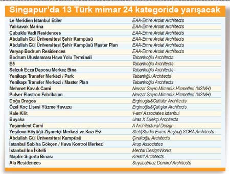 Dünya mimarlığının nabzını tutan etkinlikte, Türkiye’den 22 proje 24 kategoride finale kaldı. Jüri üyelerinin değerlendirmesi sonucunda toplamda 33 farklı kategorinin birincisi olan projeler, ‘The World Building of The Year 2012’ ve ‘Future Project of the Year 2012’ ünvanlarına erişebilmek için yarışacaklar. Ödüller, 5 Ekim Cuma günü Singapur’da yapılacak törende açıklanacak.