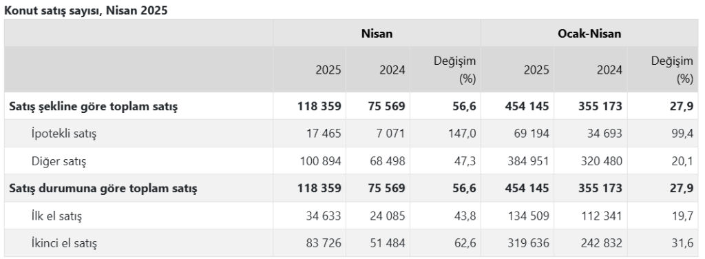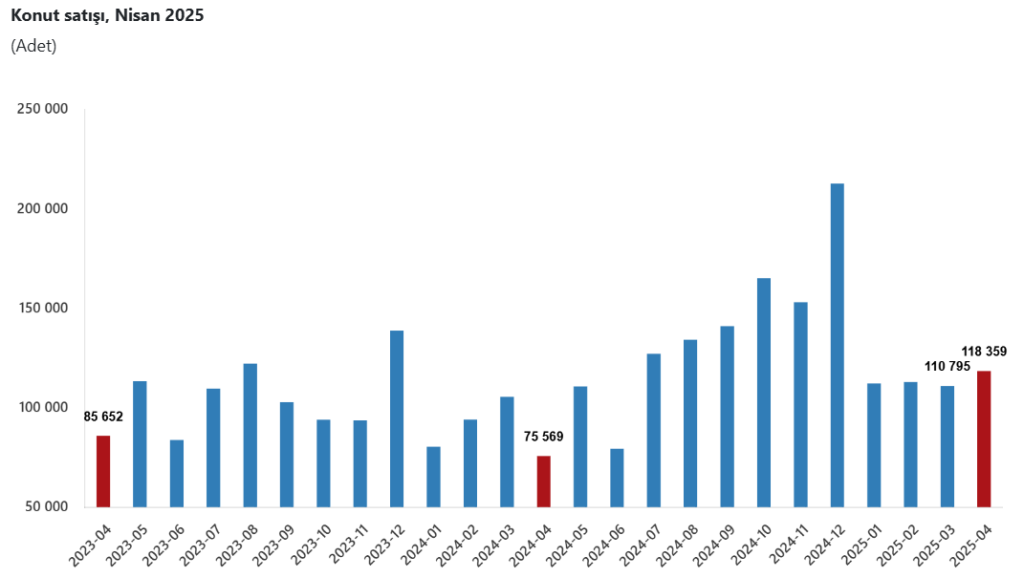 Türkiye İstatistik Kurumu (TÜİK) Nisan 2025 itibarıyla konut satış istatistiklerini yayınladı. Buna göre, Türkiye genelinde konut satışları Nisan ayında bir önceki yılın aynı ayına göre %56,6 oranında artarak 118 bin 359 oldu.