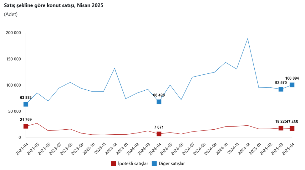Türkiye genelinde diğer konut satışları Nisan ayında bir önceki yılın aynı ayına göre %47,3 oranında artarak 100 bin 894 oldu. Toplam konut satışları içinde diğer satışların payı %85,2 olarak gerçekleşti. Ocak-Nisan döneminde gerçekleşen diğer konut satışları ise bir önceki yılın aynı dönemine göre %20,1 oranında artarak 384 bin 951 oldu.